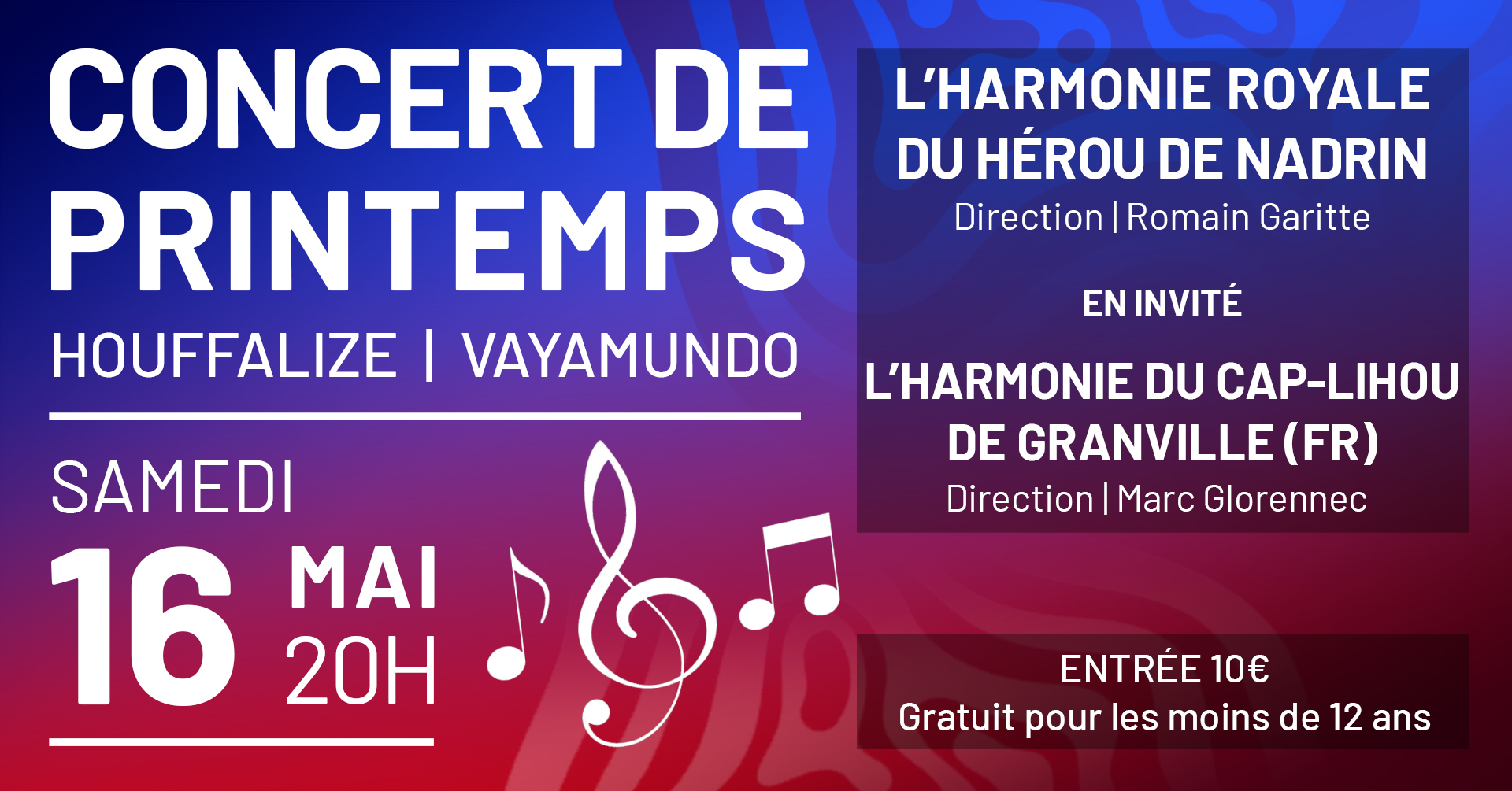 Les musiciens de l'Harmonie Royale du Hérou de Nadrin ont le grand plaisir de vous inviter à leur traditionnel "Concert de Printemps".